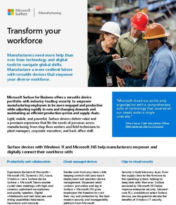This datasheet showcases how Surface devices can address the unique challenges faced by various roles in manufacturing. View: Surface inā¦