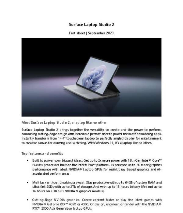 Surface Laptop Studio 2 Fact Sheet