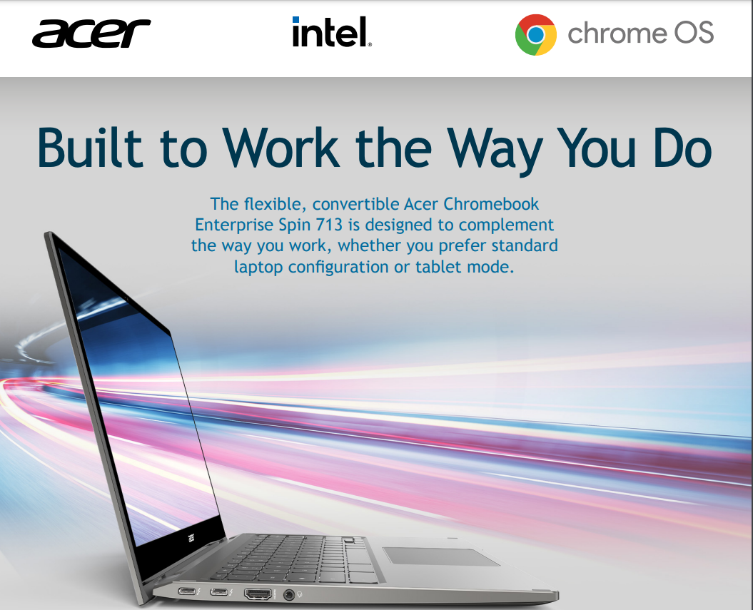 The flexible, convertible Acer Chromebook Enterprise Spin 713 is everything your hybrid workforce needs to do more. Evo™ certified and…