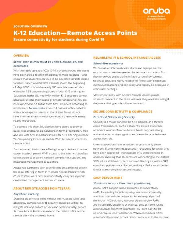 This solution overview explains that Aruba has partnered with several telecom carriers to deliver the ideal offering in the form of "Remote…