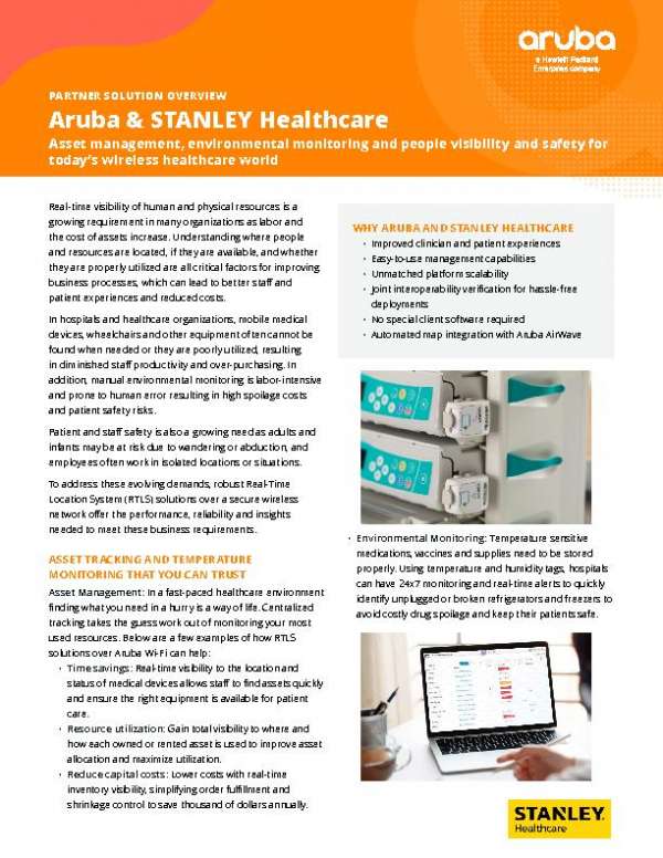 This partner solution overview provides information regarding the capabilities and benefits of Aruba and STANLEY Healthcare joint solutions…