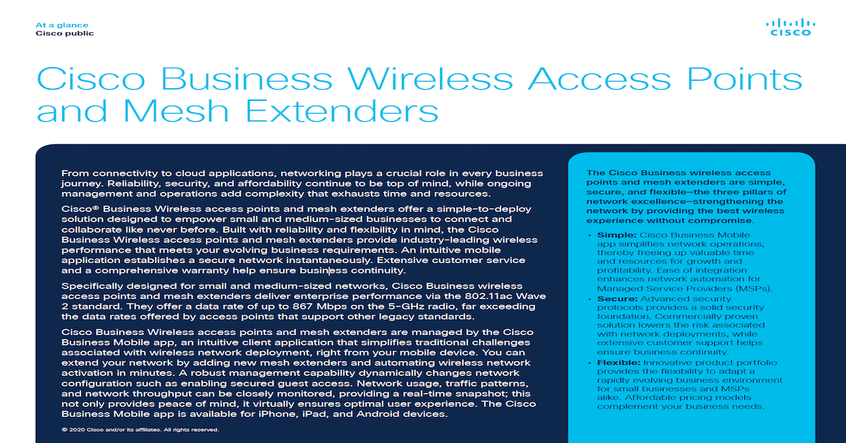 This at-a-glance overview describes how Cisco Business Wireless access points and mesh extenders offer small to medium-size networks…