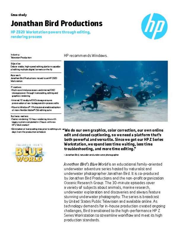 This solution brief outlines the need for powerful hardware at Jonathan Bird Productions, and it discusses how the HP Z820's performance…