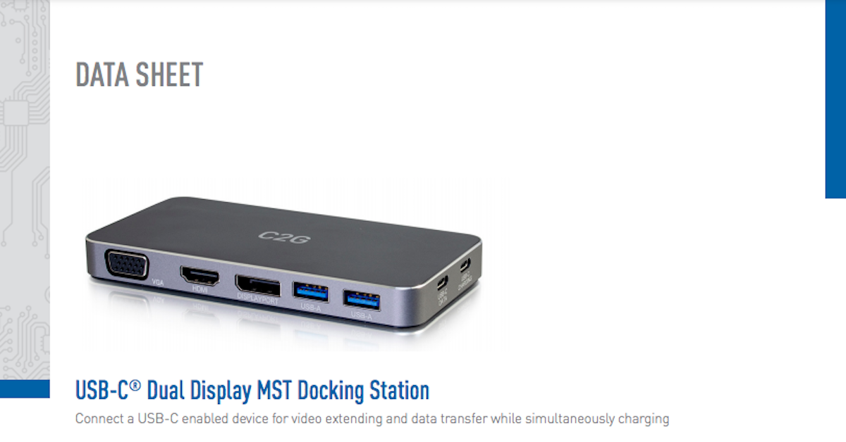 This datasheet details the C2G Dual Display MST Docking Station, a device offering USB-C, HDMI, and DisplayPort connectivity, among other…