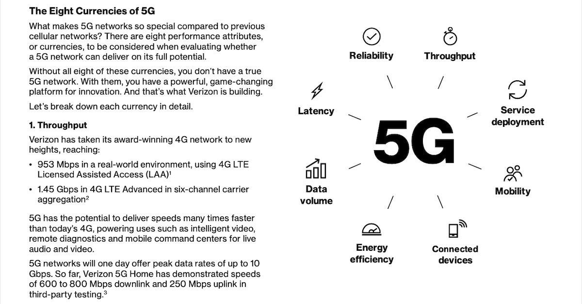 This flyer details the eight currencies that Verizon 5G offers, including low latency, the ability to handle large amounts of data, plus…