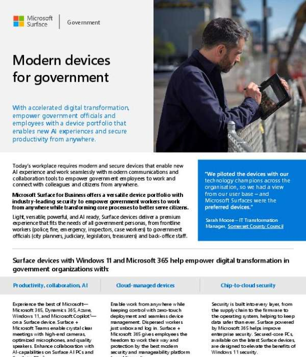 This flyer highlights the value of the Surface device portfolio for government agencies, including AI experience, chip-to-cloud security,…